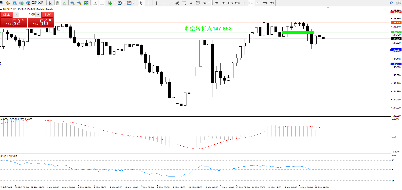 交易策略:147.852下方看跌,目标146.957146.234