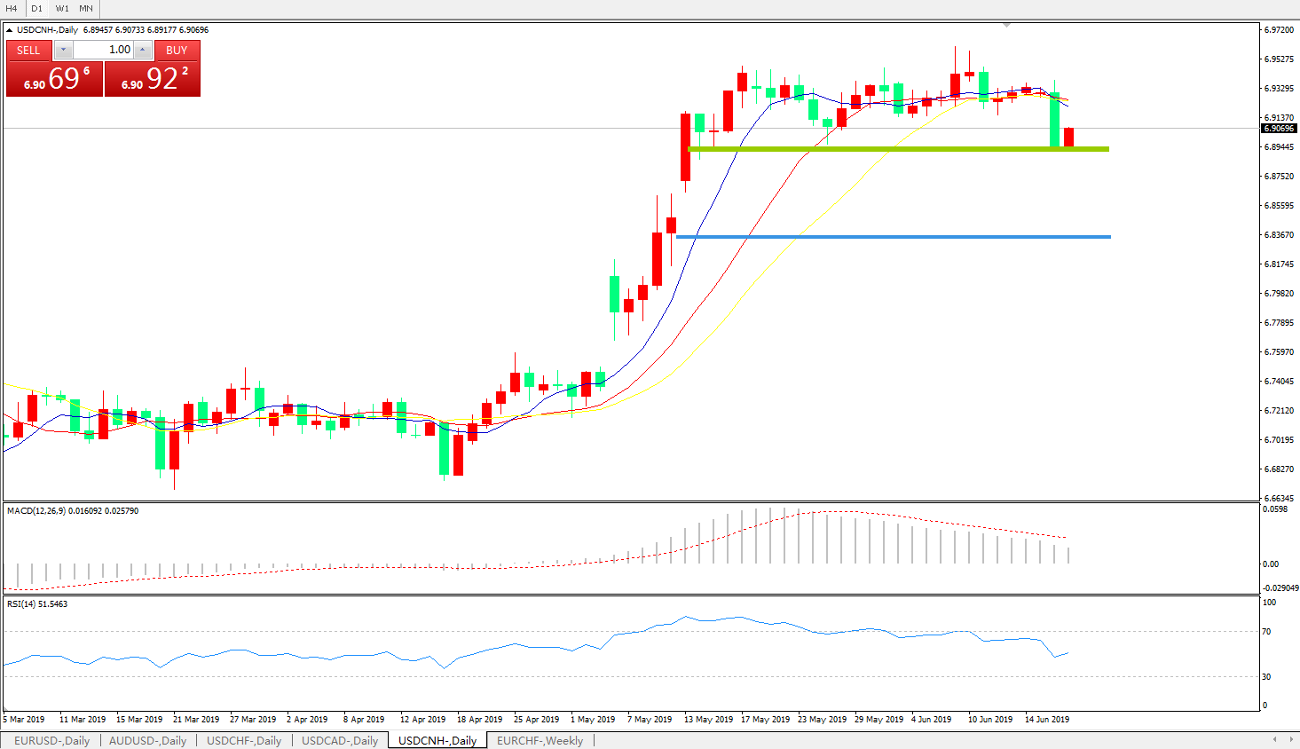 技术面简析:日线均线有发散下行迹象MACD0轴上方向下运行且动能柱持续缩量RSI逐步走低,预计短期汇价有继续回落需求,贸易争端缓解及G20是目前焦点,需持续关注