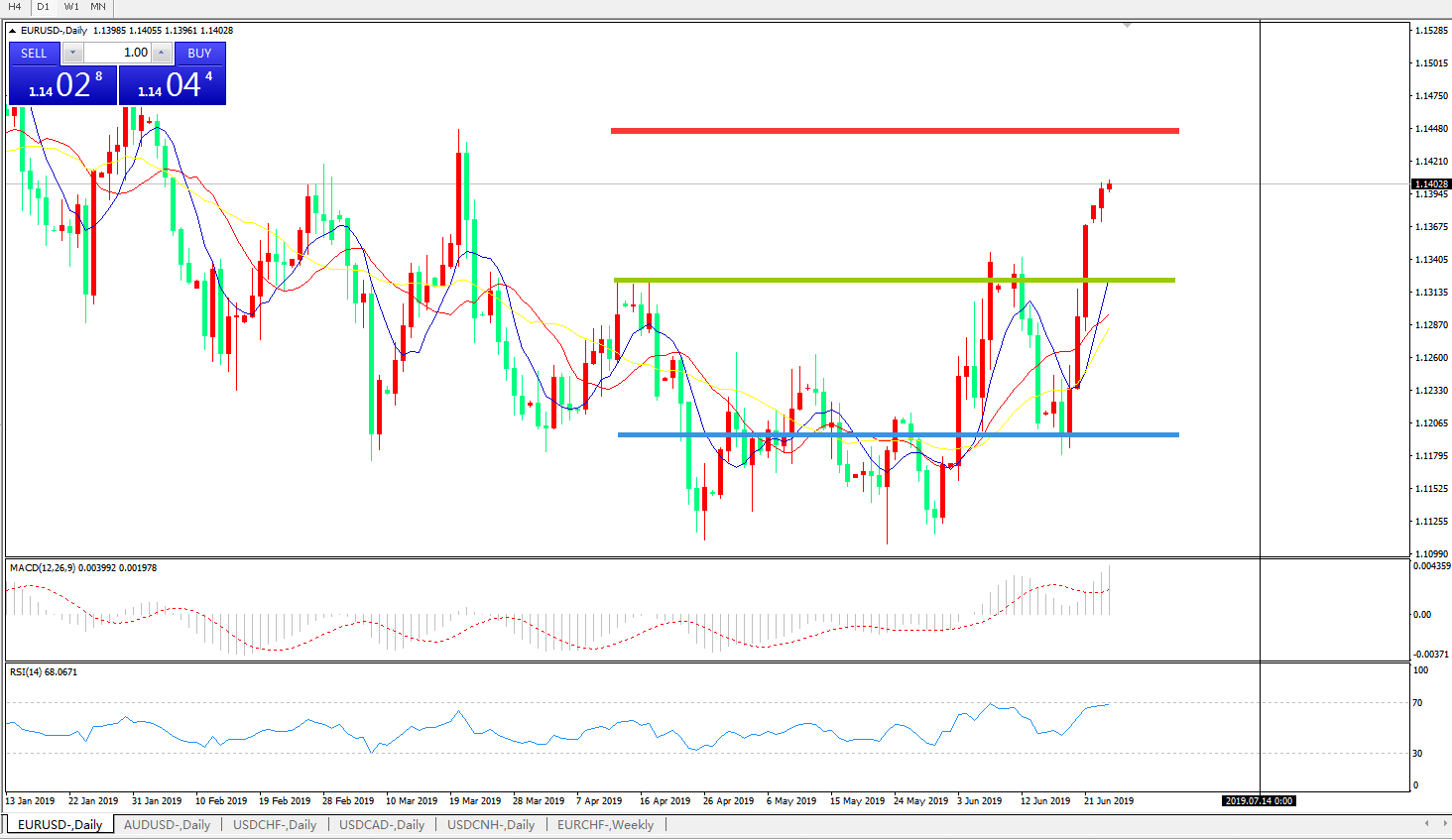 技术面简析:日图均线呈有序多头排列,汇价继续强势上攻,MACD在0轴上方运行且持续放量,RSI逼近超卖区域,预计汇价将进一步上行。