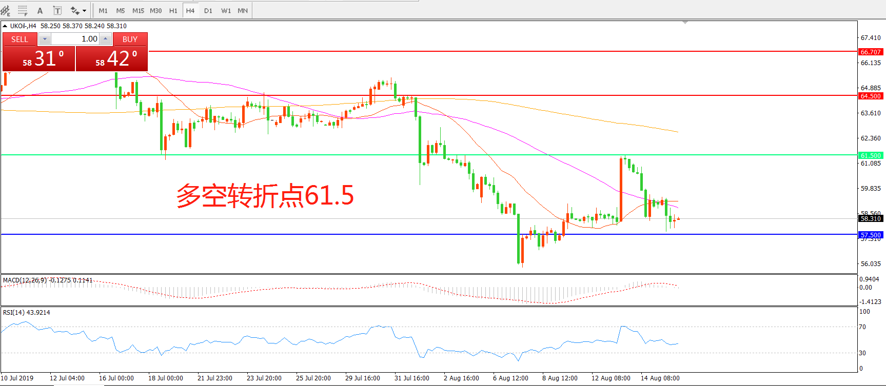 周四(8月15日),针对美国贸易代表办公室宣布将对约3000亿美元自华进口商品加征10%关税,国务院关税税则委员会有关负责人表示,中方将不得不采取必要的反制措施,这令中美贸易紧张局势继续升温,风险情绪遭受抑制令原油连跌两日。布伦特原油震荡下行,收报58.31美元/桶。