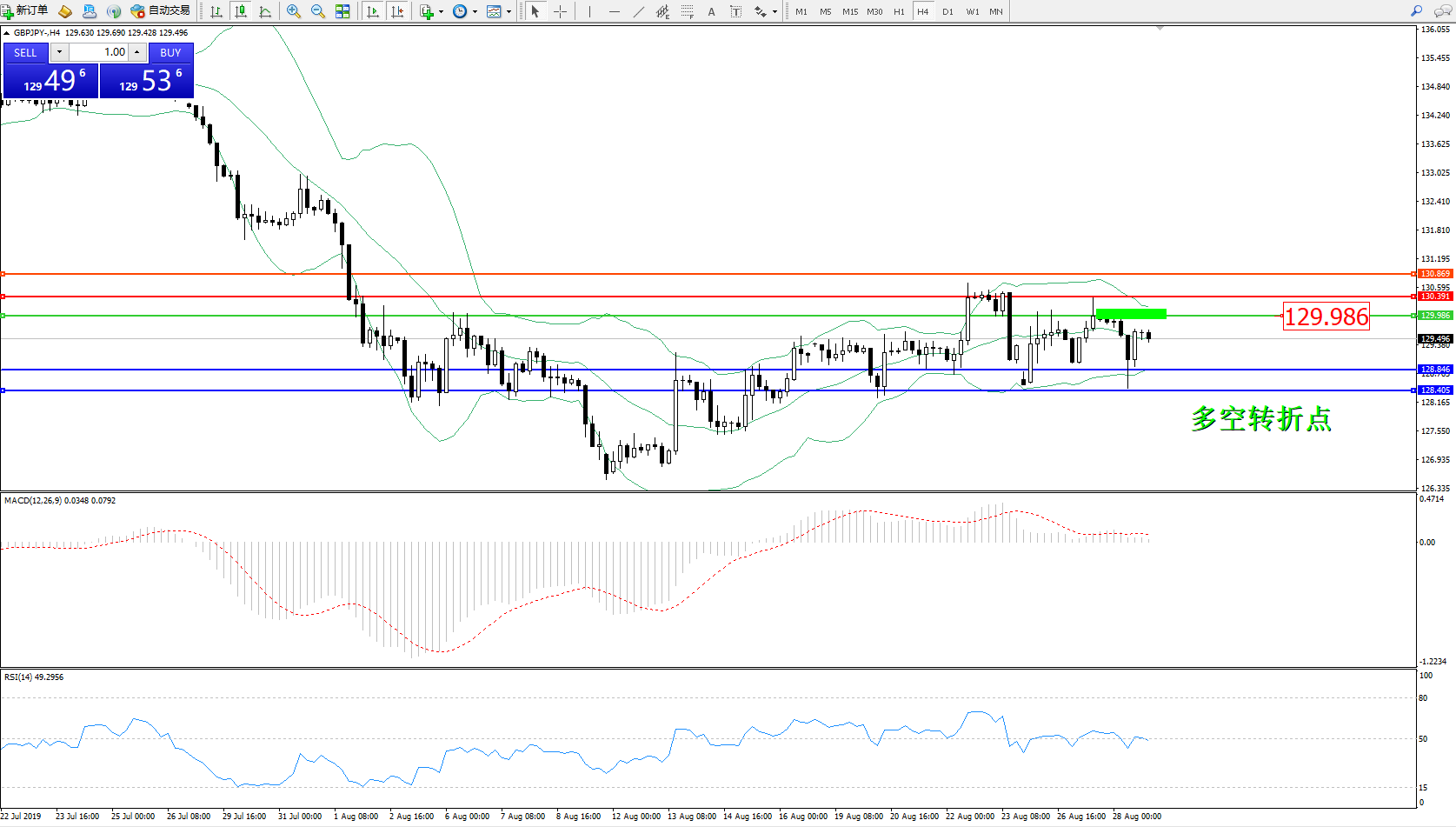 交易策略:129.986下方看跌,目标128.846、128.405