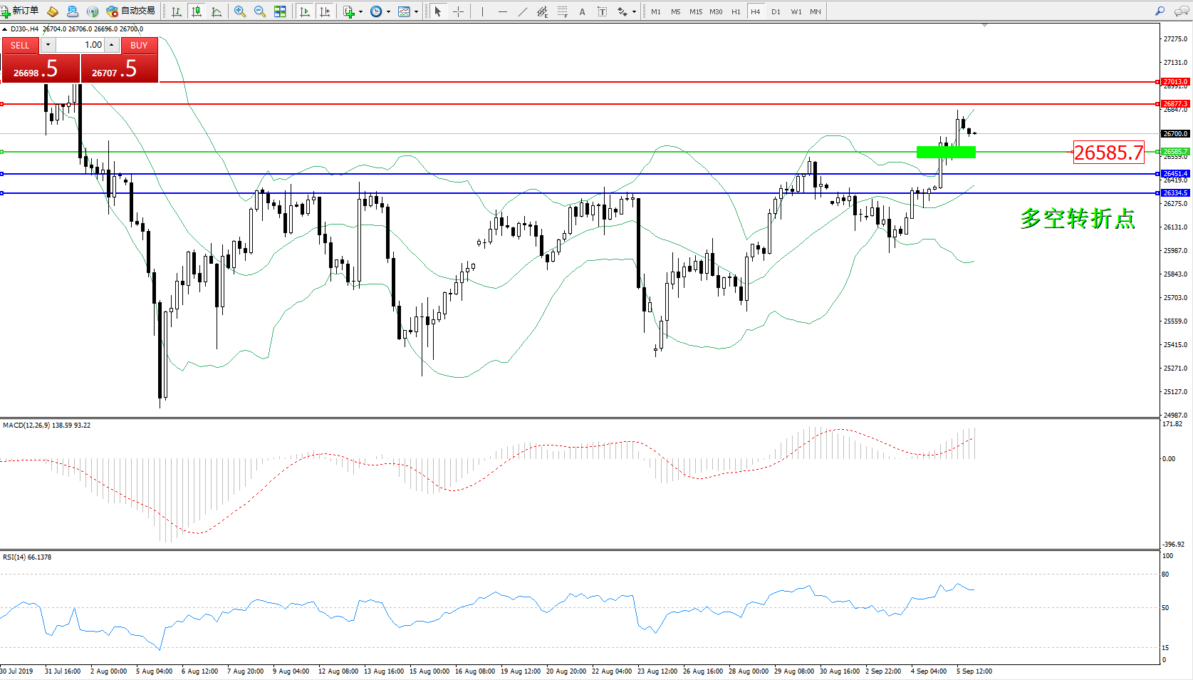 道琼斯指数DJ30—— 4小时K线图显示: