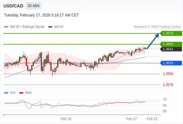 在 1.3615 之上,看涨,目标价位为 1.3650 ,然后为 1.3670 。