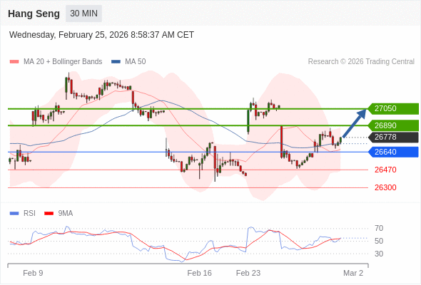 恒生指数 当日内: 目标位为27050。