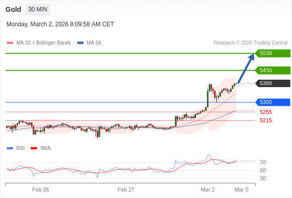 交易策略: 在 5300 之上,看涨,目标价位为 5450 ,然后为 5530 。