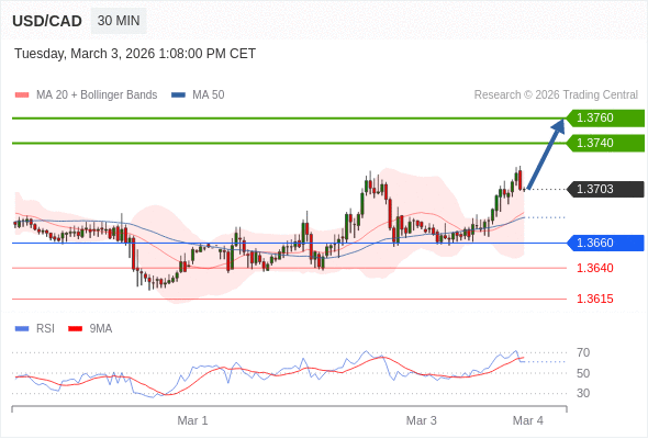在 1.3660 之上,看涨,目标价位为 1.3740 ,然后为 1.3780 。