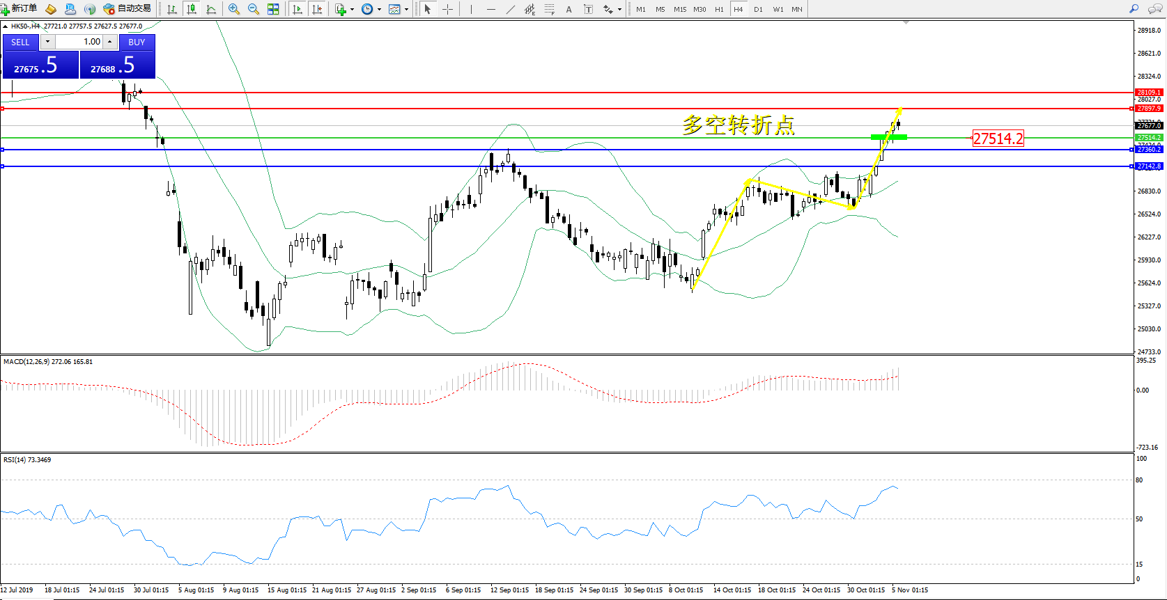 恒指HK50 ——4小时K线图显示: