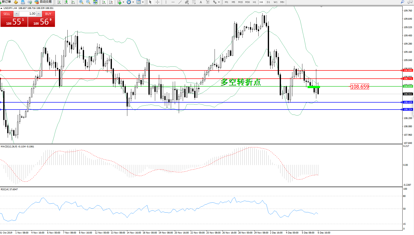 交易策略:108.659下方看跌,目标108.428、108.324