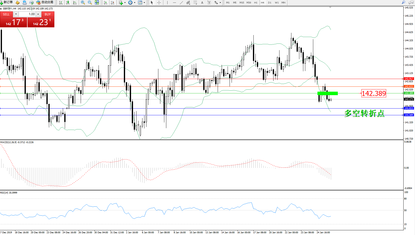 交易策略:142.389下方看跌,目标141.833、141.589