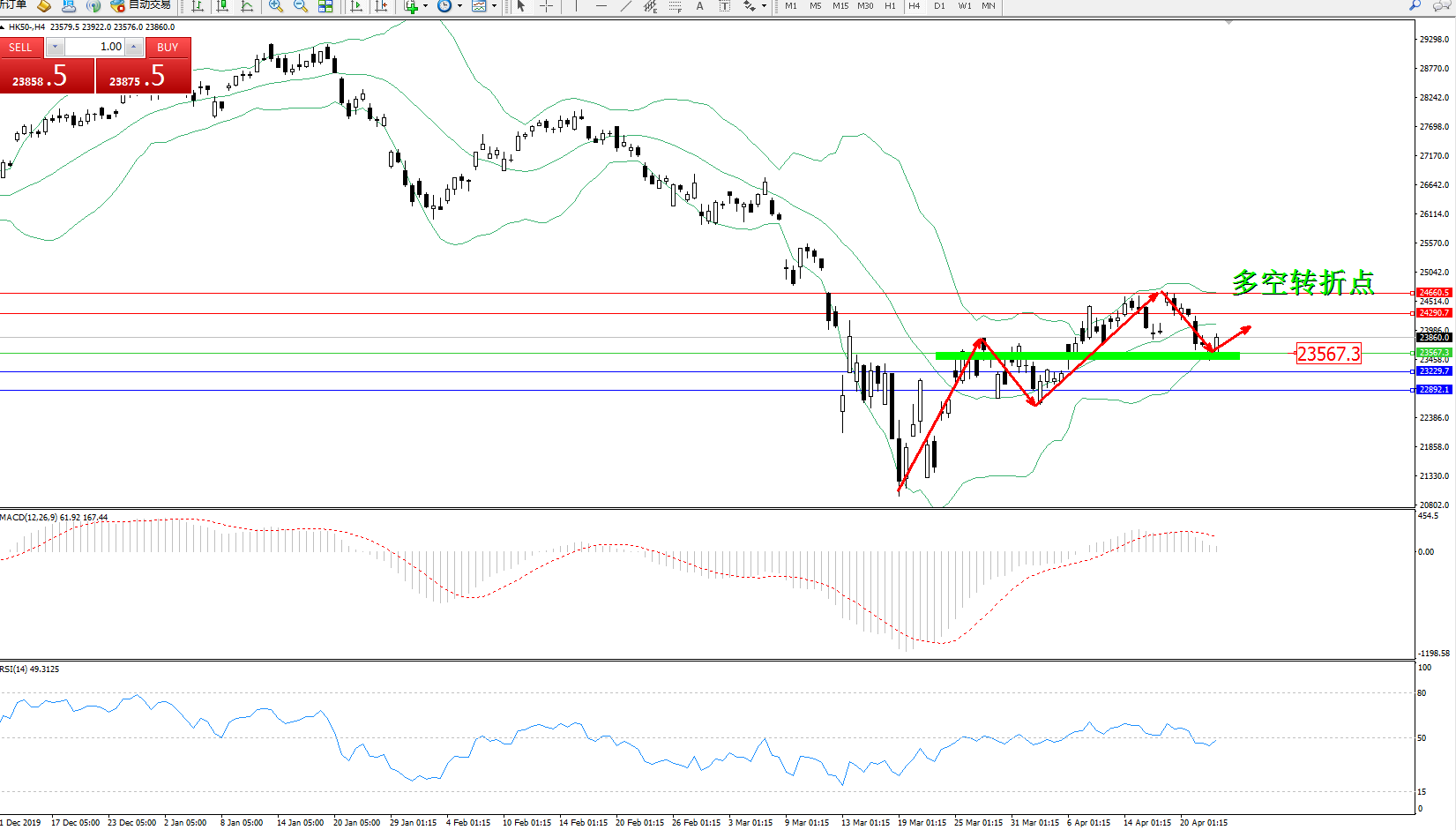 恒指HK50 ——4小时K线图显示: