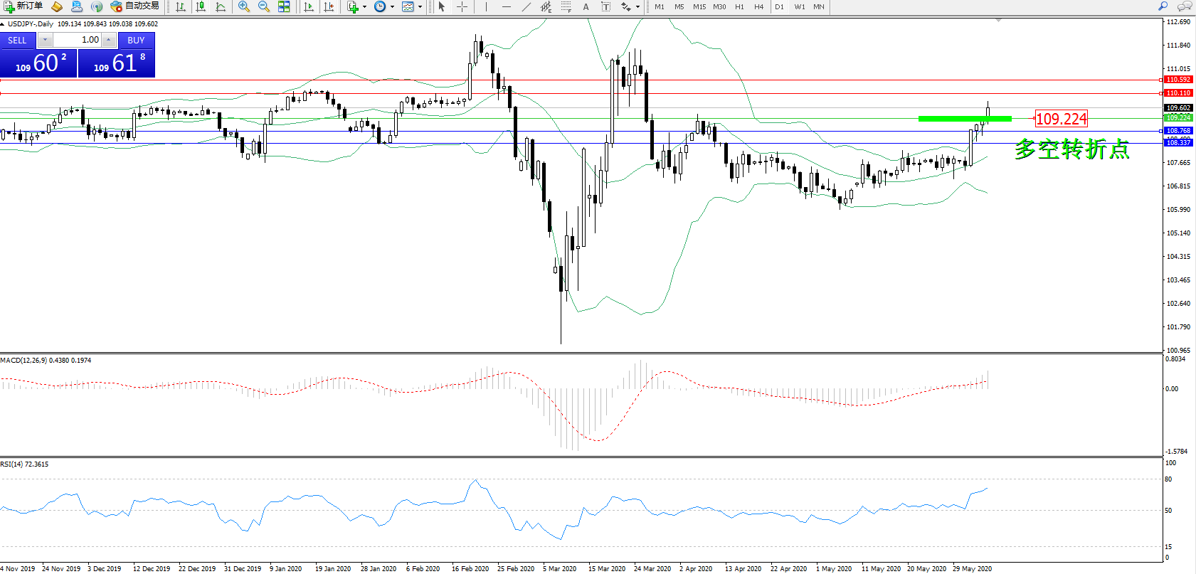 交易策略:109.224上方看涨,目标110.110110.592