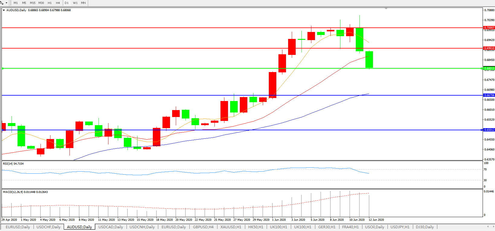 技术面简析:日图均线呈有序多头排列但短期均线快速下行,汇价连续大跌呈弱势,MACD运行于0轴上方但量能微缩量,RSI自高位持续走弱,预计汇价大概率将下行修正,短期关注下方0.68关口支撑。