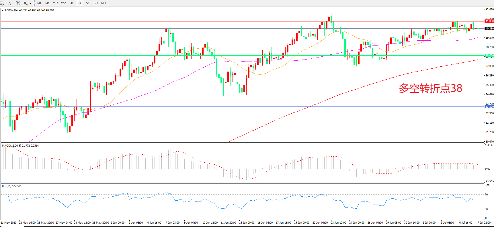 4小时图看,油价延续高位震荡,整体波幅不大,55周期均线成为短期支撑,41成为短期阻力,MACD红柱增加,RSI指标走平,日内延续震荡概率较大。