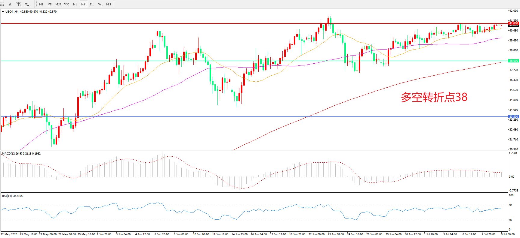4小时图看,油价延续高位震荡,整体波幅不大,55周期均线成为短期支撑,41成为短期阻力,MACD红柱增加,RSI指标走平,日内延续震荡概率较大。