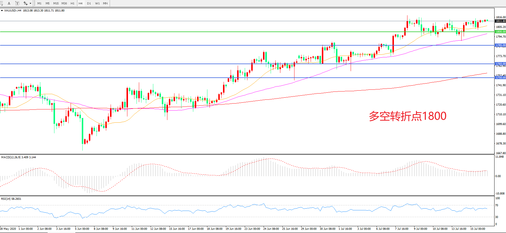 交易策略:在1800.00之上看涨,目标1820.00   1845.00