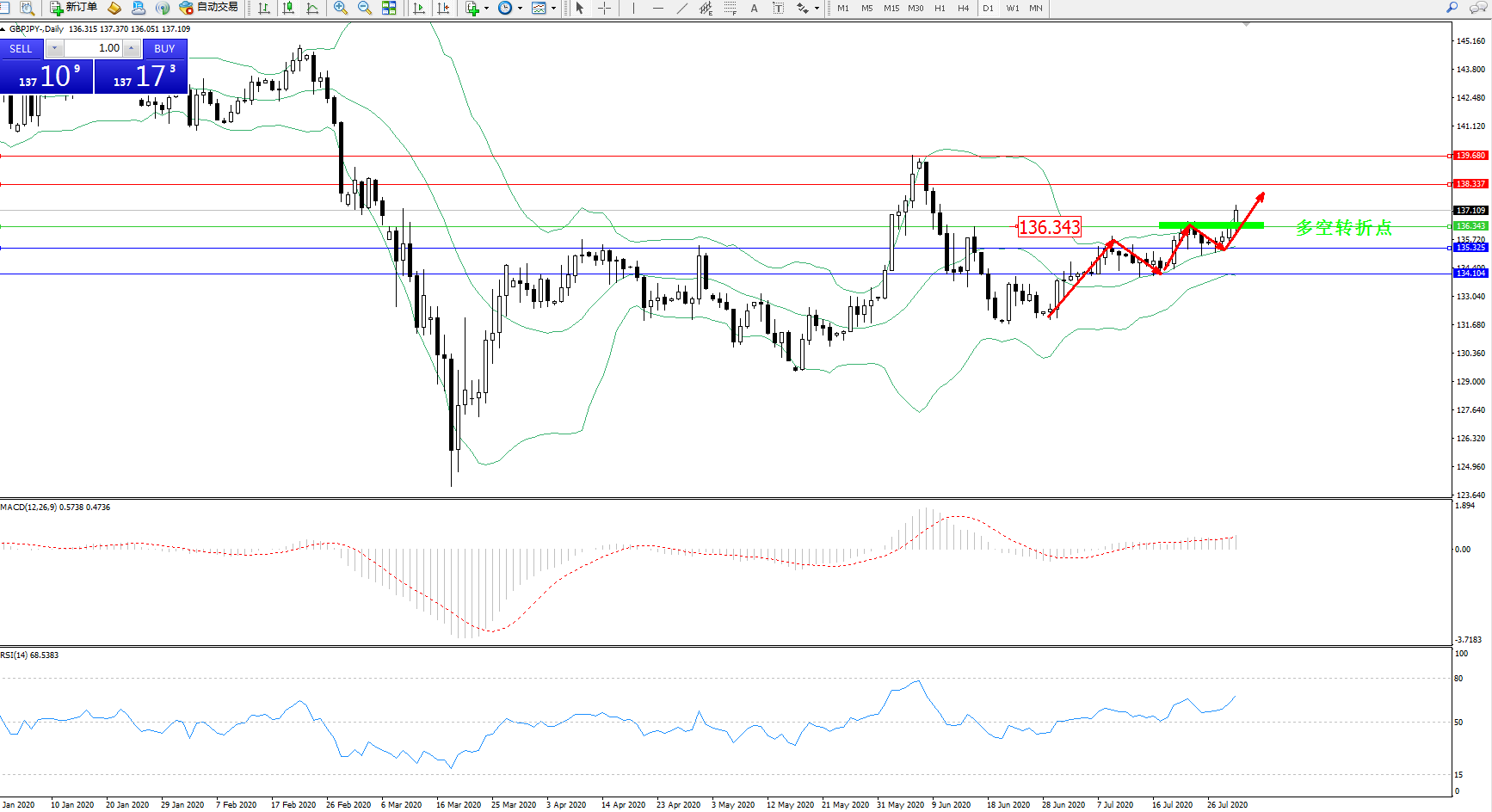 交易策略:136.343上方看涨,目标138.337、139.680