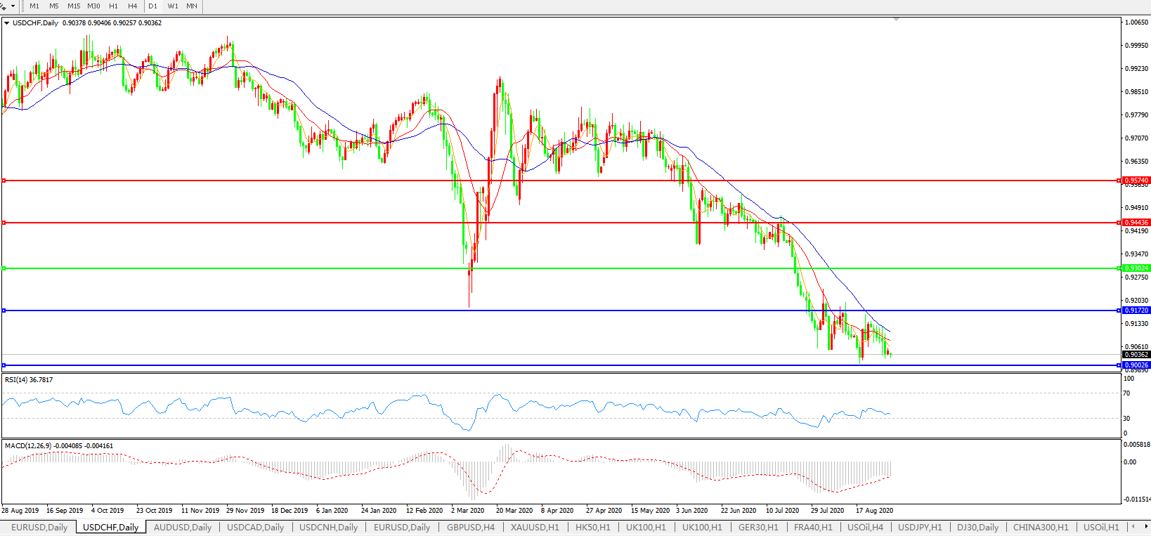 技术面简析:日图均线整体呈空头排列,汇价持续弱势,MACD运行于0轴下方且量能放量,RSI持续走低,预计短期汇价大概率将进一步下行。