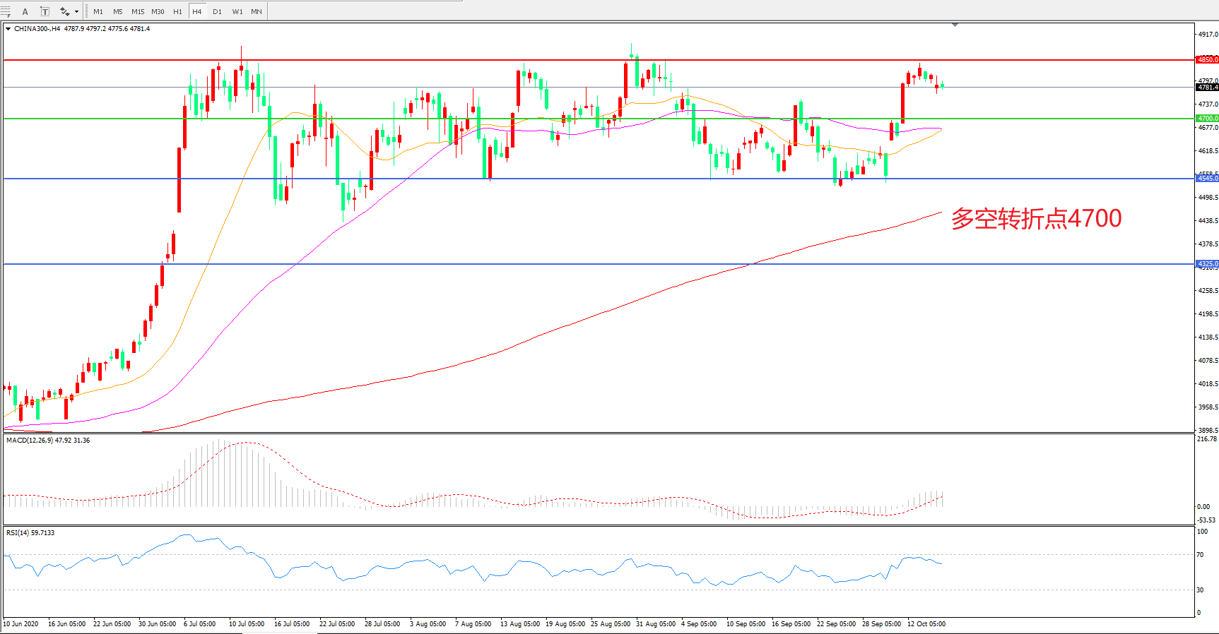 4小时图看,沪深300延续震荡上行,短期走势依然偏强,4850成为上方短期阻力,均线系统走平, MACD红柱增加,RSI指标向上,日内延续上行概率较大。