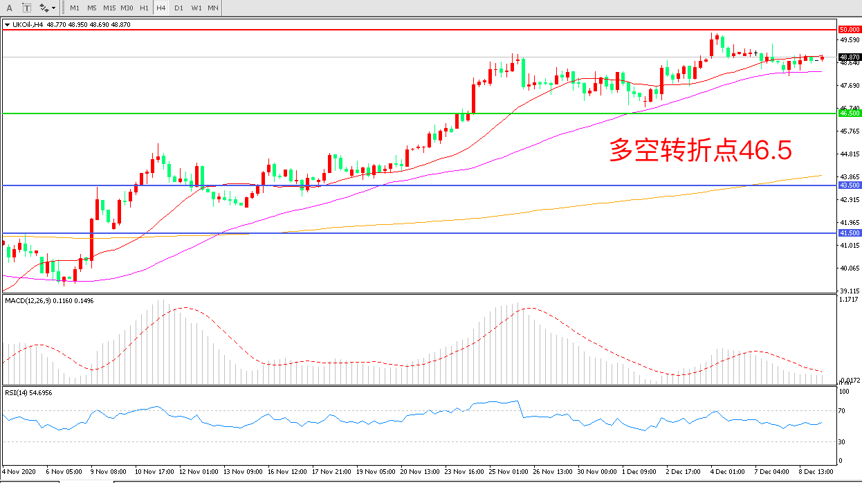 4小时图看,油价延续高位震荡,短期涨势有所回调,55周期均线成为短期支撑,50美元成为中期阻力,MACD红柱减少,RSI指标走平,日内延续震荡概率较大。