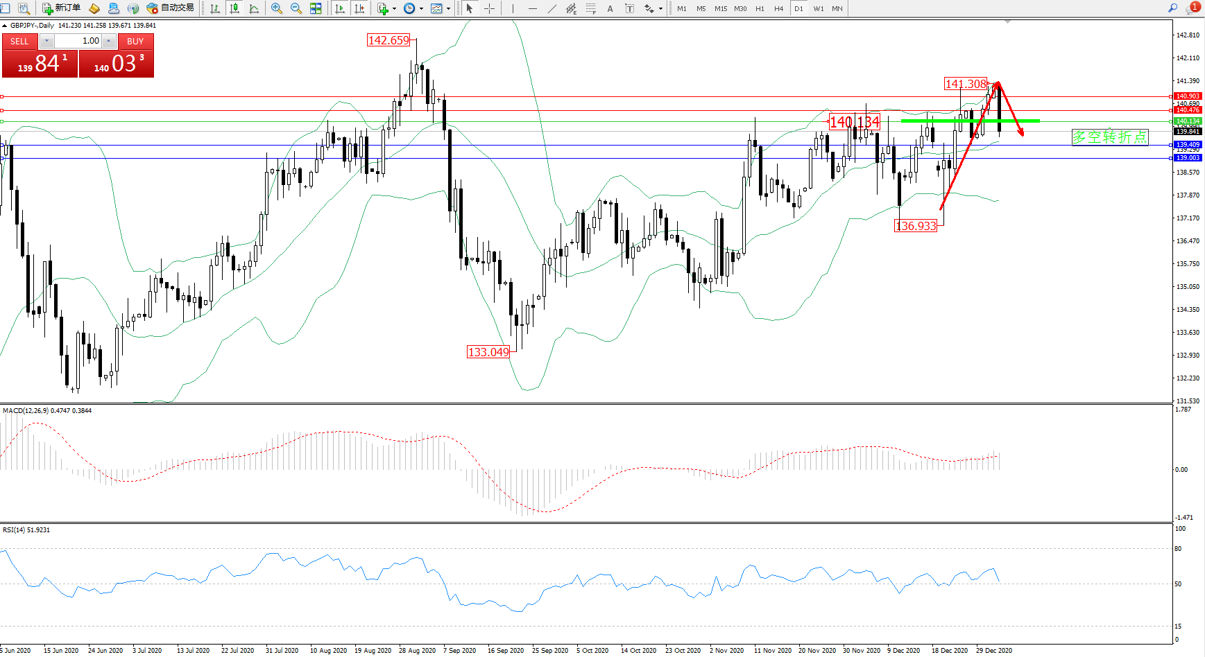 技术点评:多头动力延续布林带指标通道内持续宽幅震荡后持续拉升上扬,纠结于布林带指标中上轨区间高位整理,抵达141.308位置节点后出现快速回撤,即将触及布林带指标中轨附近节点,布林带指标呈张口走势后有收口迹象,MACD指标处于0轴线上方持续窄幅整理中,RSI指标处于50均衡线上方维持震荡后出现回撤向下移动;