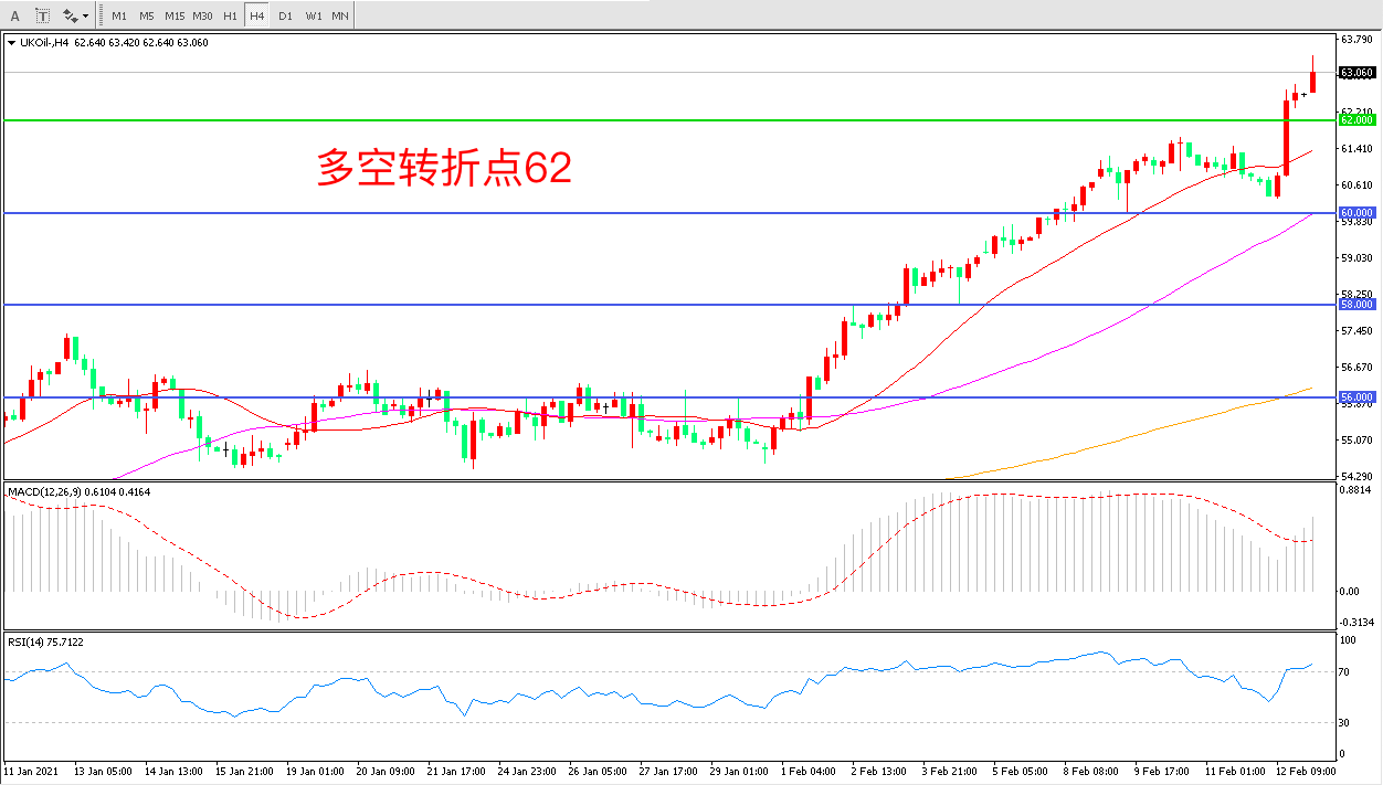 4小时图看,油价连续上涨后再度突破,上行趋势十分明显,62美元被顺势突破,行情进入加速阶段,MACD红柱增加,RSI指标向上,日内延续上行概率较大。