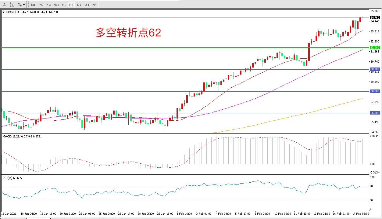 交易策略:  在62.00之上看涨,目标65.00 68.00