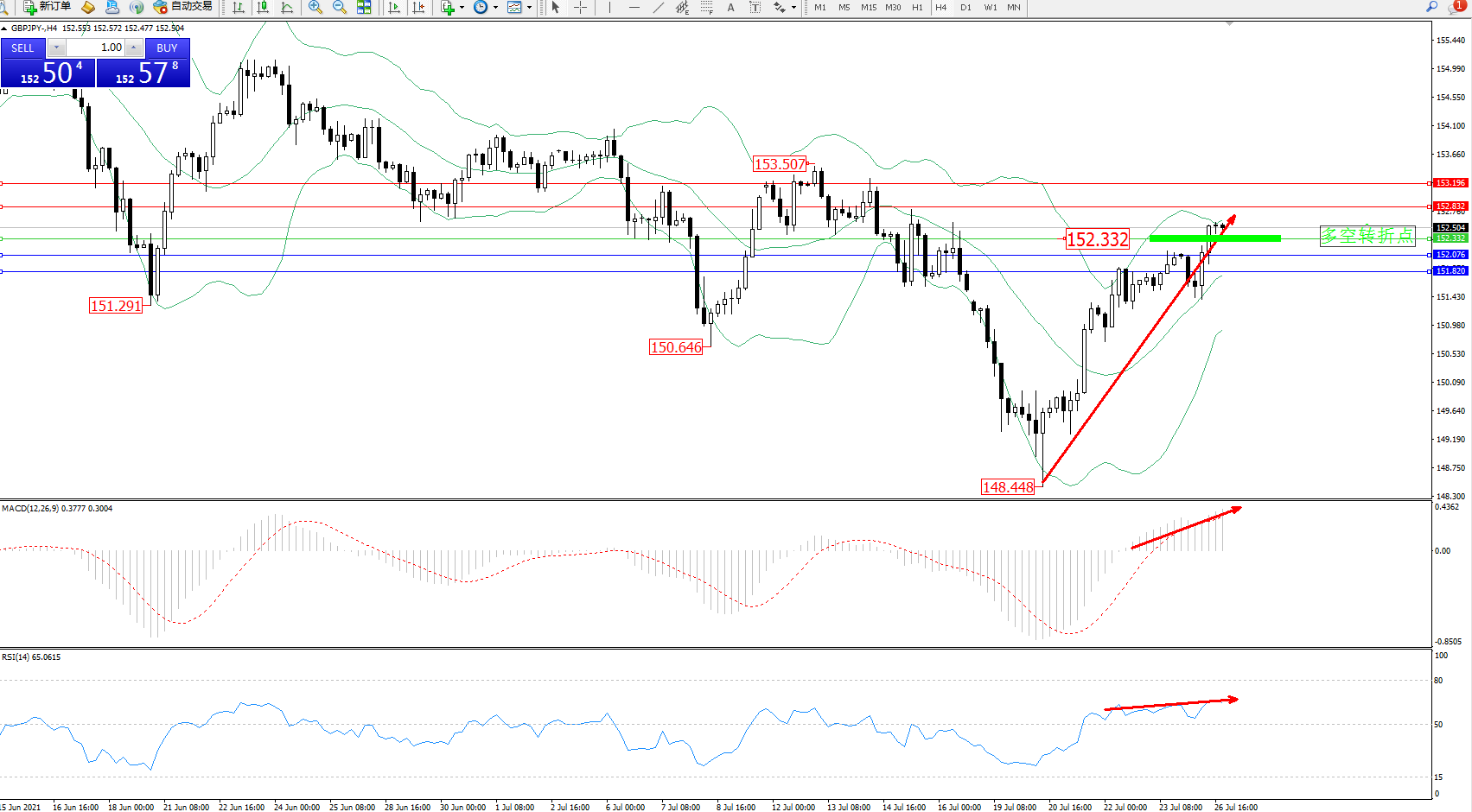 交易策略:152.332上方看涨,目标152.832、153.196