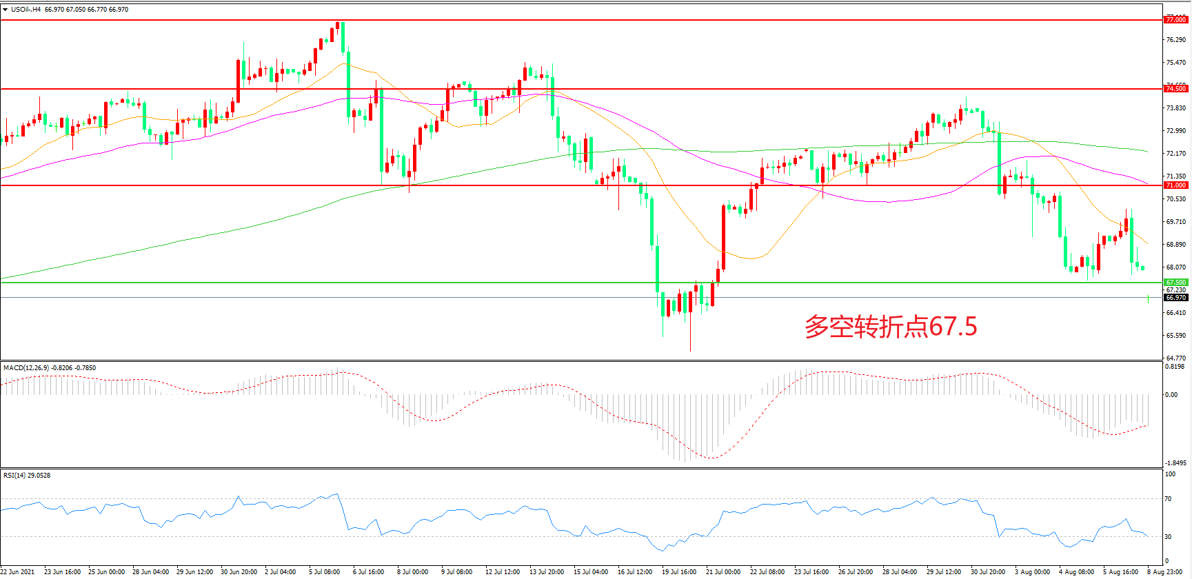 交易策略:在67.50之下看跌,目标64.00       60.00