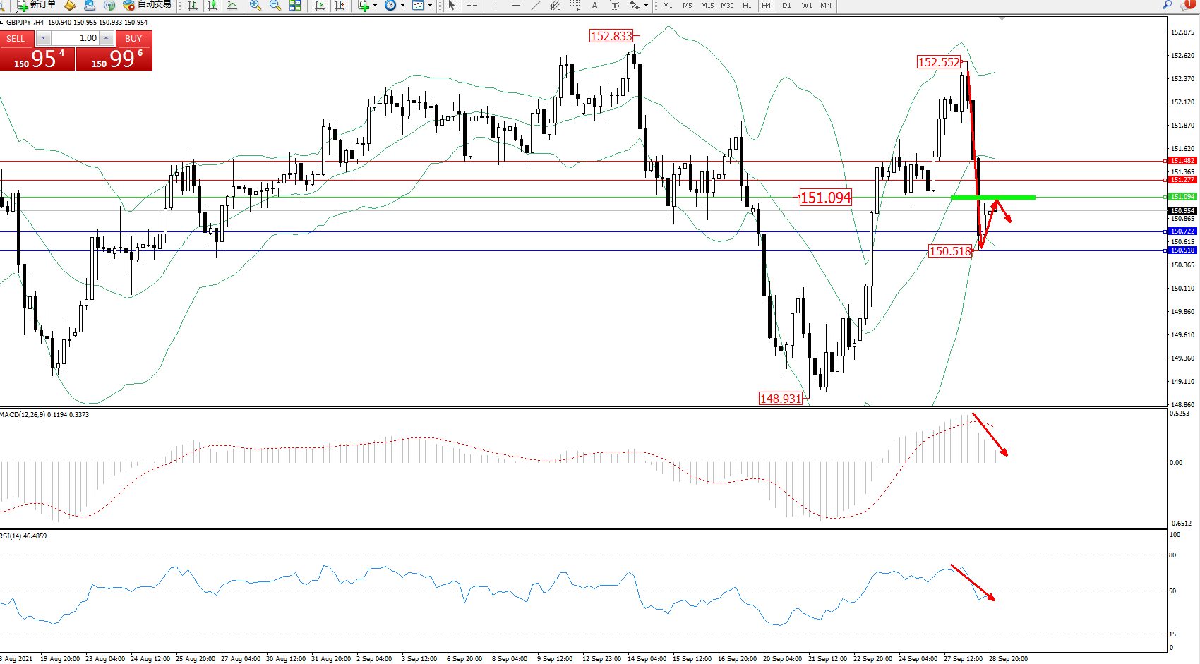 交易策略:151.094下方看跌,目标150.722、150.318