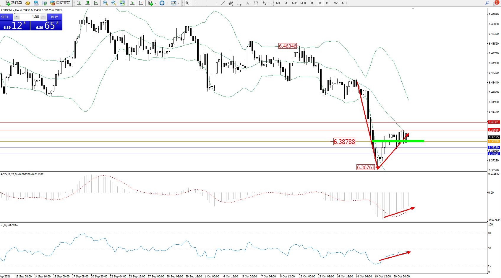 美元人民币USDCNH——4小时K线图显示: