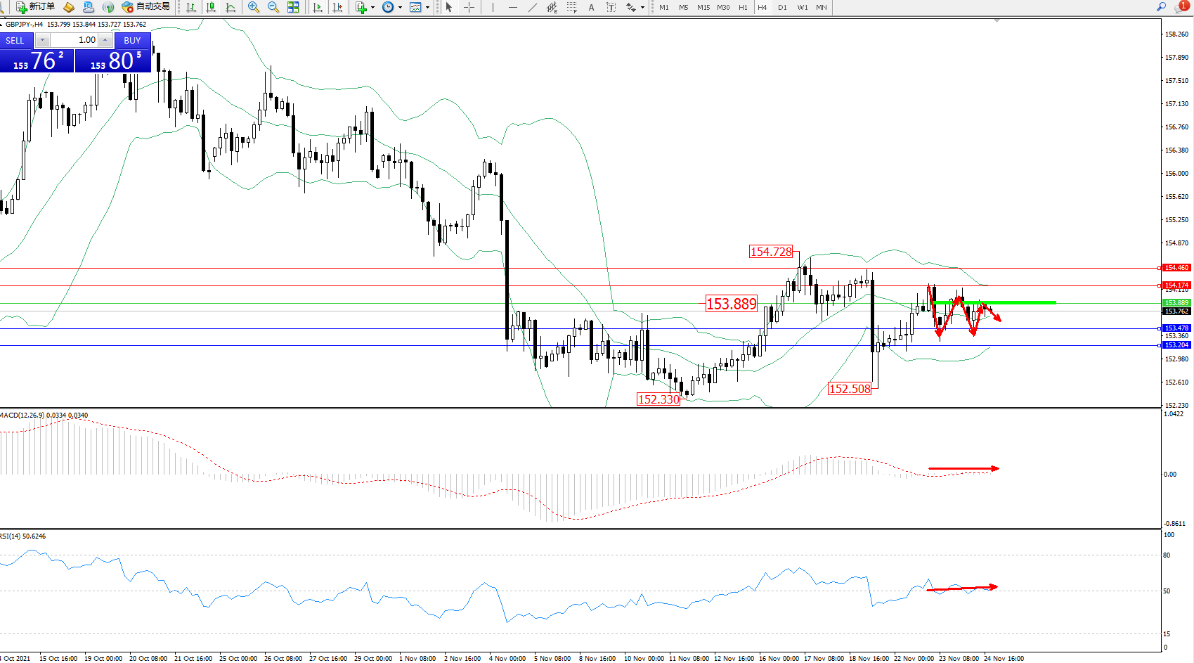 交易策略:153.889下方看跌,目标153.478、153.204