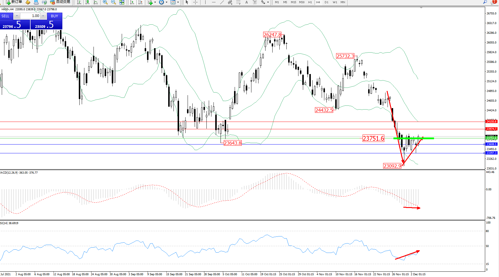 恒指HK50 ——4小时K线图显示: