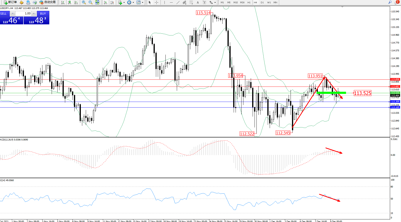 交易策略:113.525下方看跌,目标113.309、113.169