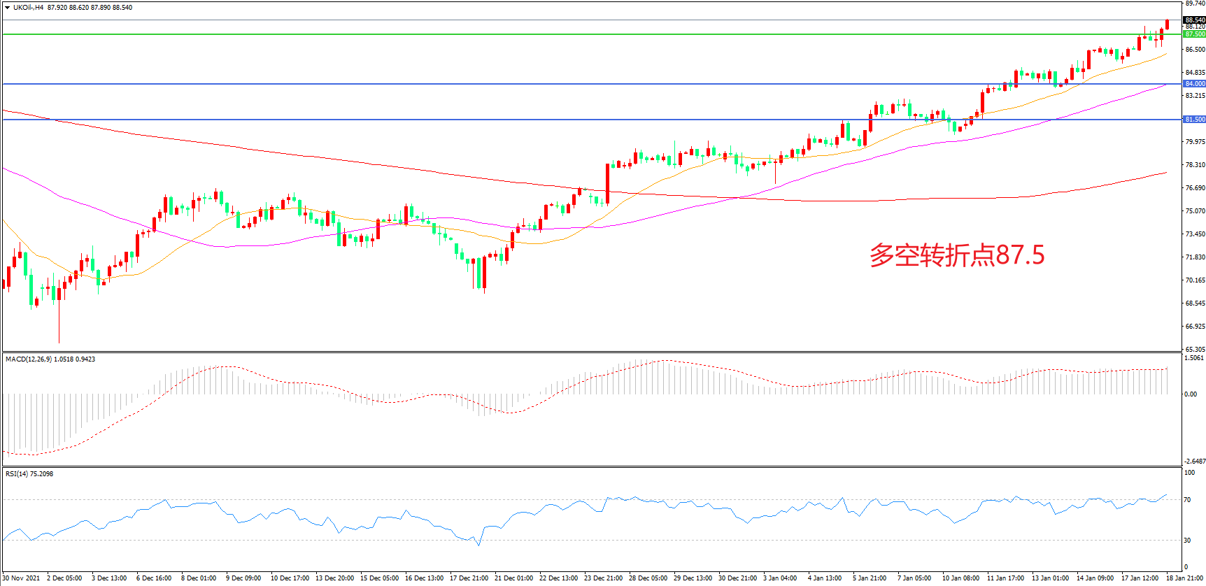 4小时图看,油价低点逐渐抬高,整体表现偏强,均线系统呈多头排列,87.5美元成为多空分水岭,MACD红柱增加,RSI指标走平,日内震荡上行概率较大。