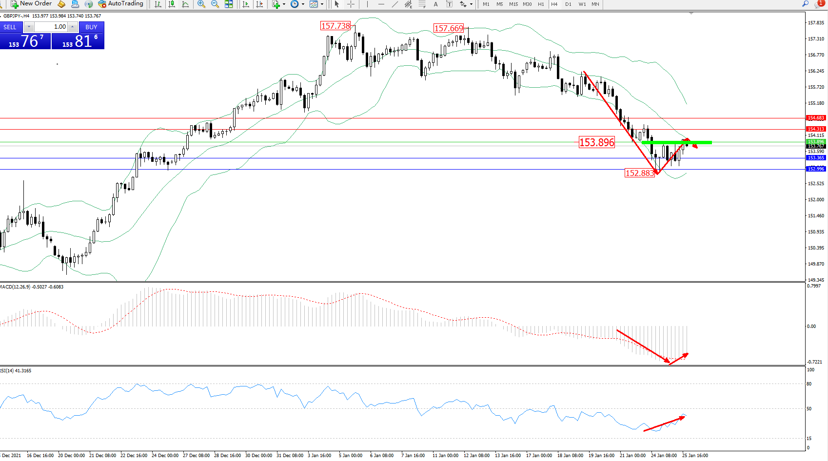 交易策略:153.896下方看跌,目标153.365、152.996
