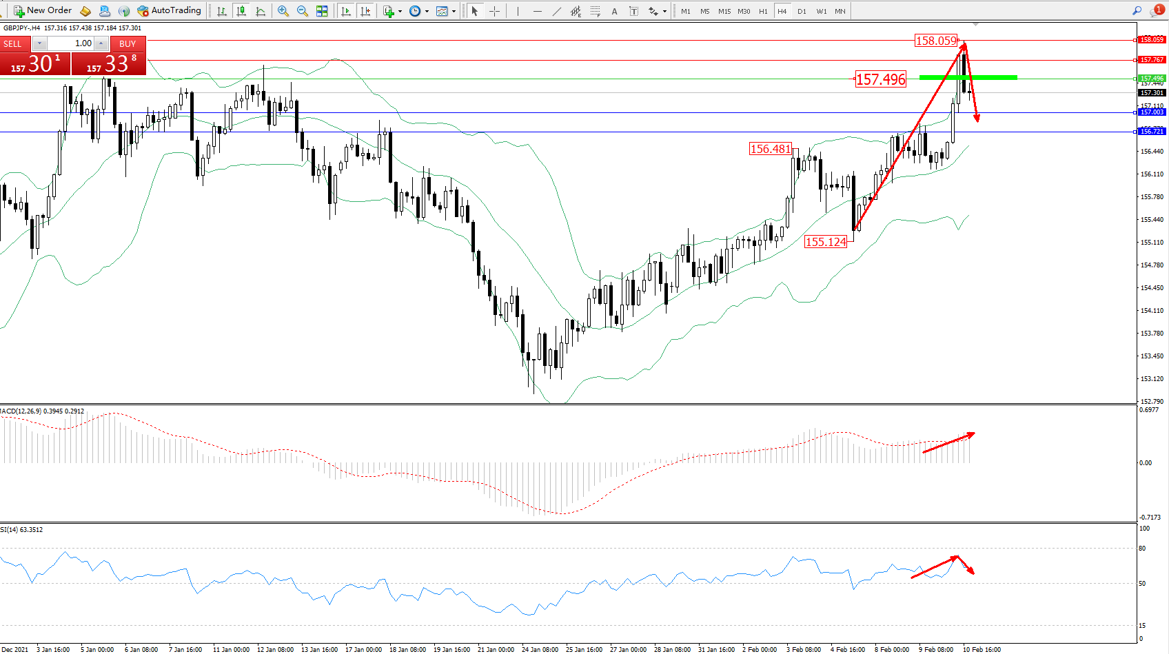 交易策略:157.496下方看跌,目标157.003、156.721