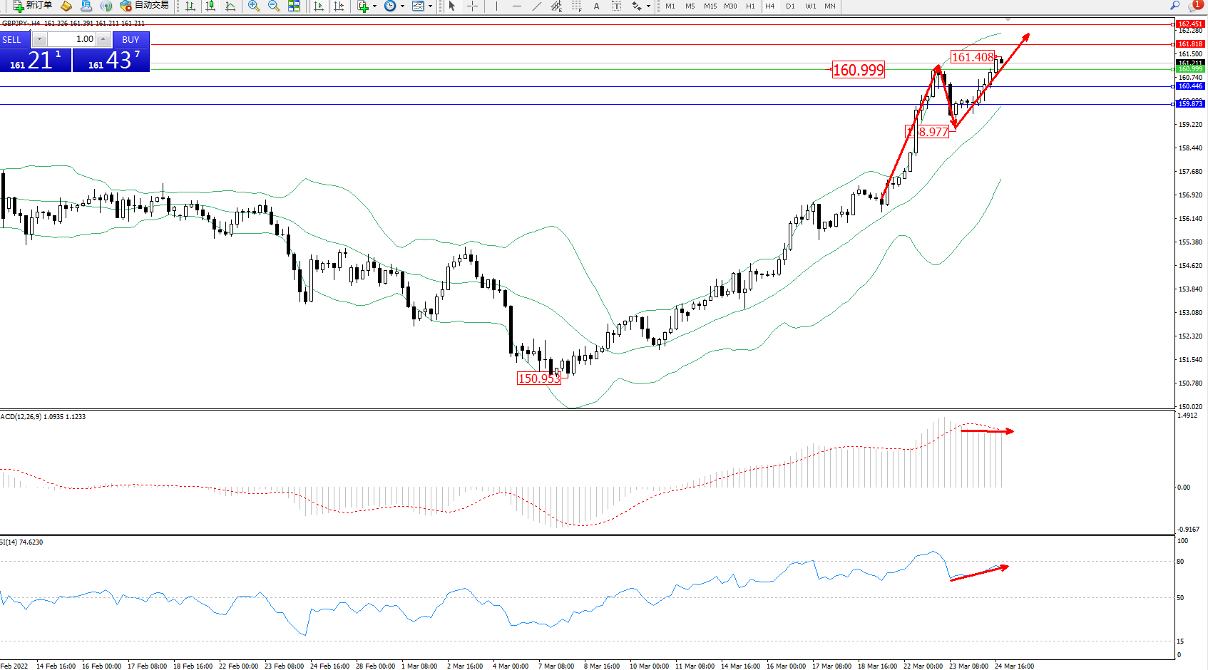 交易策略:160.999上方看涨,目标161.818、162.451