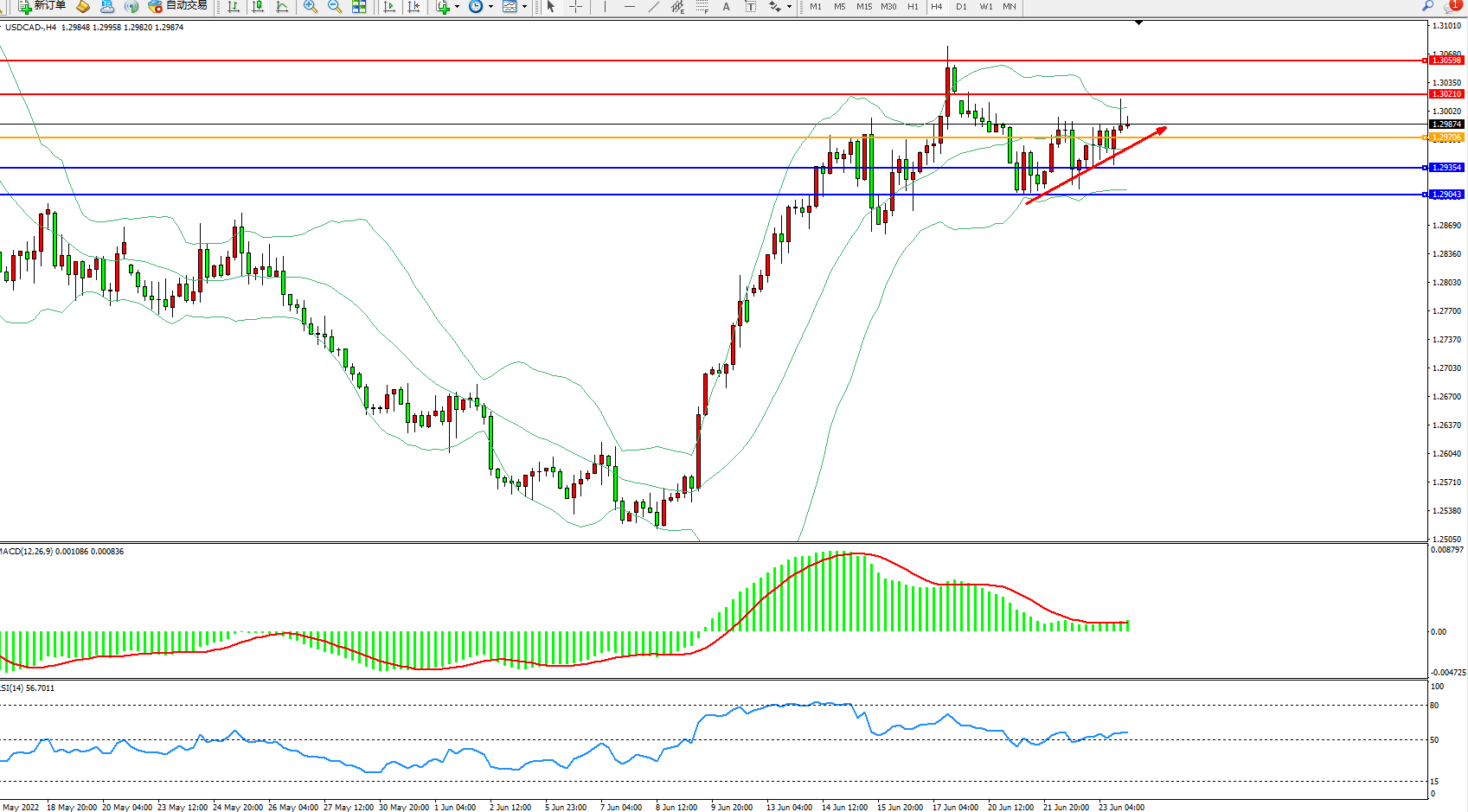美元加元USDCAD——4小时K线图显示: