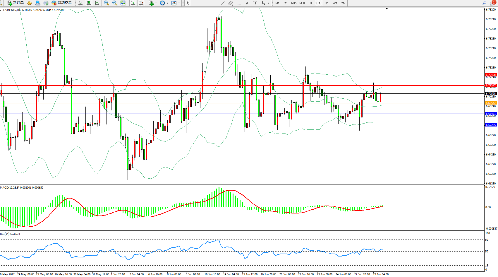 美元人民币USDCNH——4小时K线图显示: