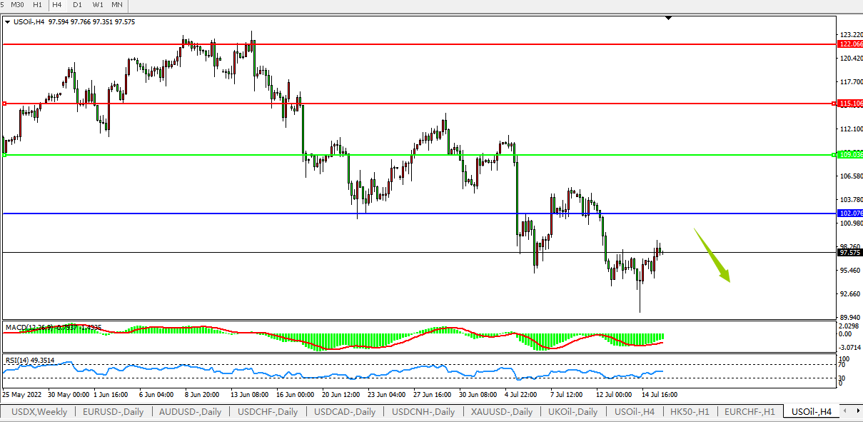 美油价格维持震荡下行。美国方面公布的6月CPI数据意外大幅度超预期,使得市场对美联储大幅升息的预期升温,这不利于油价。