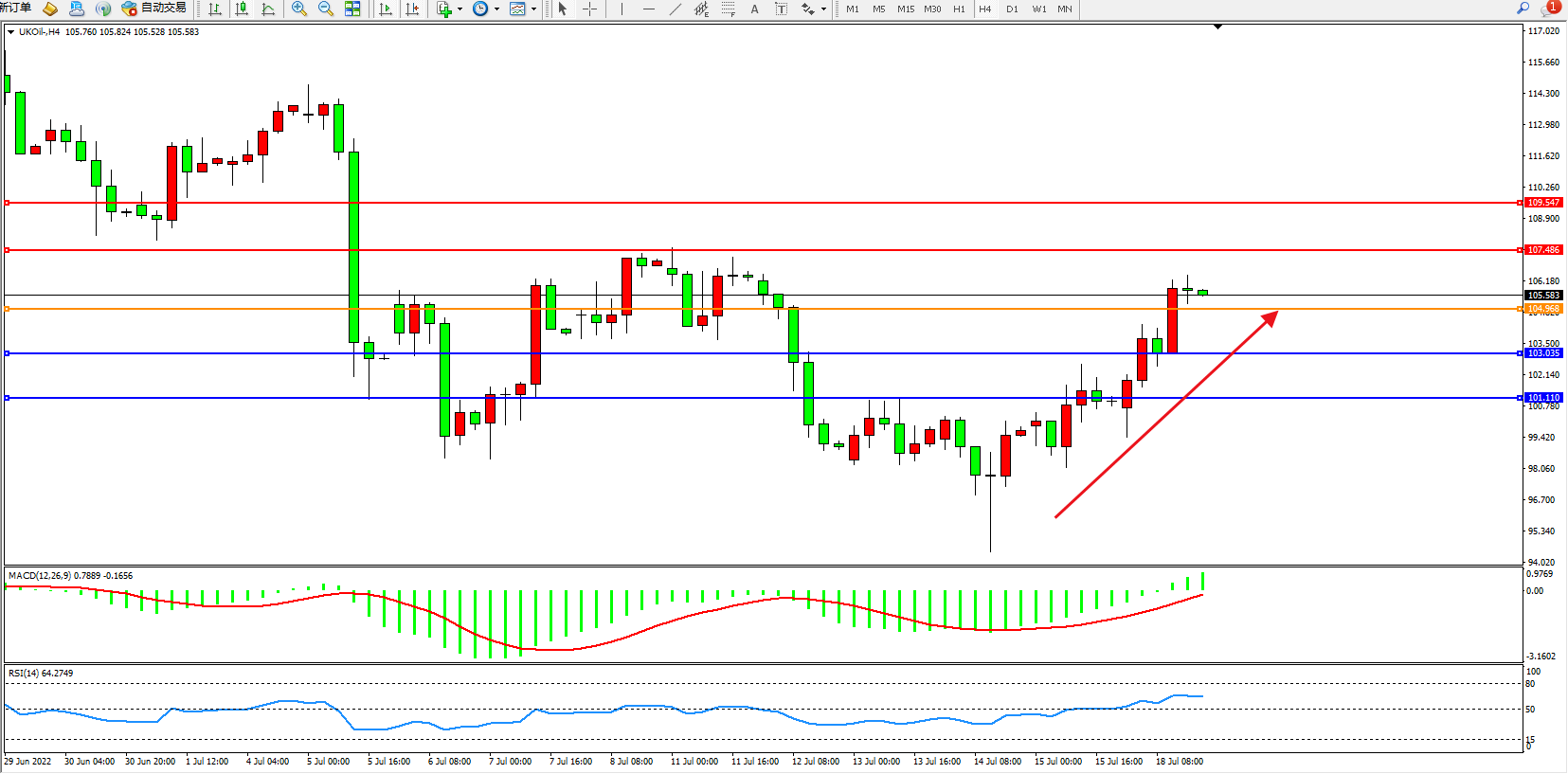交易策略:104.968上方看涨,目标107.486、109.547