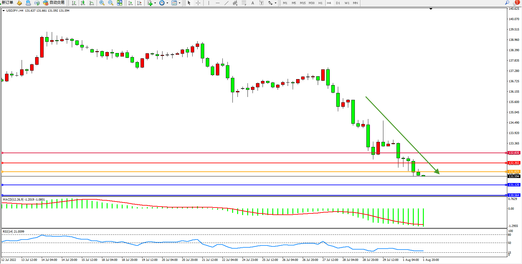 交易策略:131.825下方看跌,目标131.120、130.564