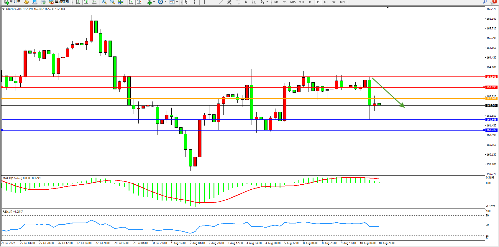 交易策略:162.606下方看跌,目标161.666、161.202