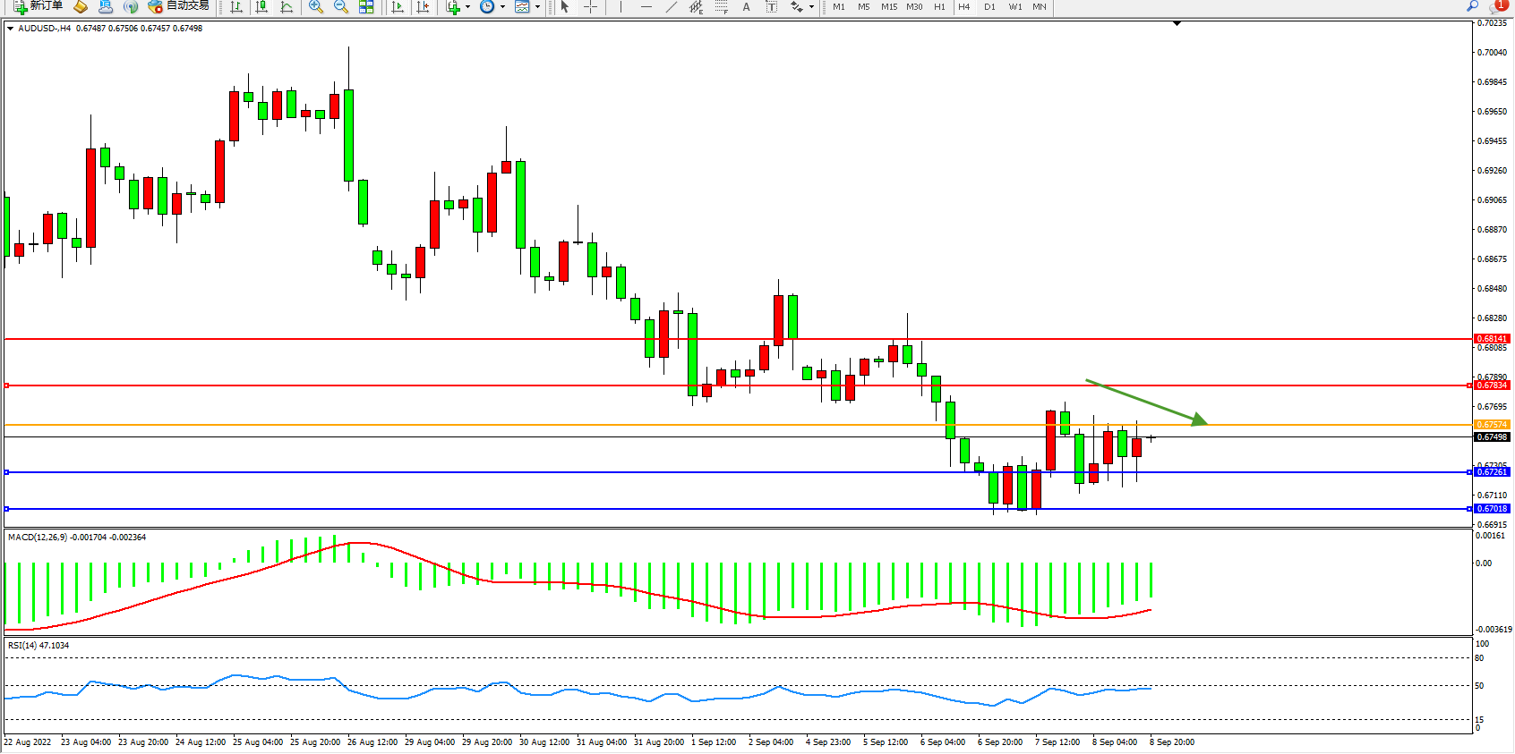 澳元美元AUDUSD——4小时K线图显示: