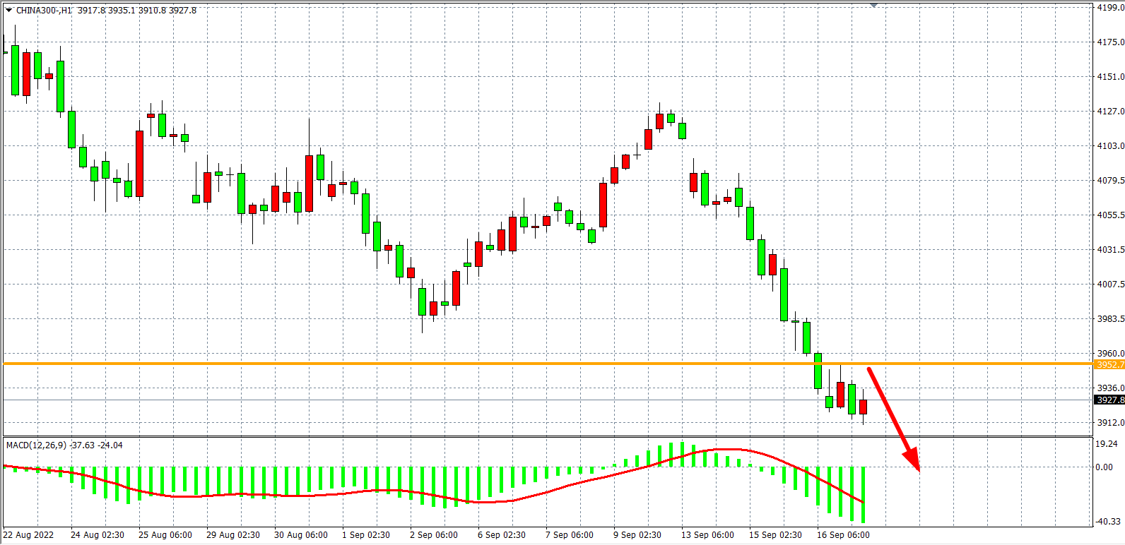1小时图看,沪深300再创出新低,K线图出现短线企稳信号,同时MACD于零轴之下仍持续放量,目前阻力位已下移至3950附近,日内在该位之下继续看跌为主,下方支撑3900-3860