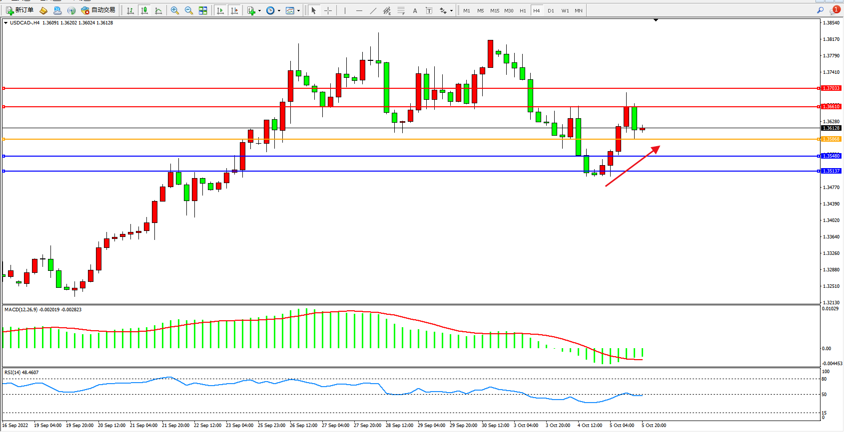 美元加元USDCAD——4小时K线图显示: