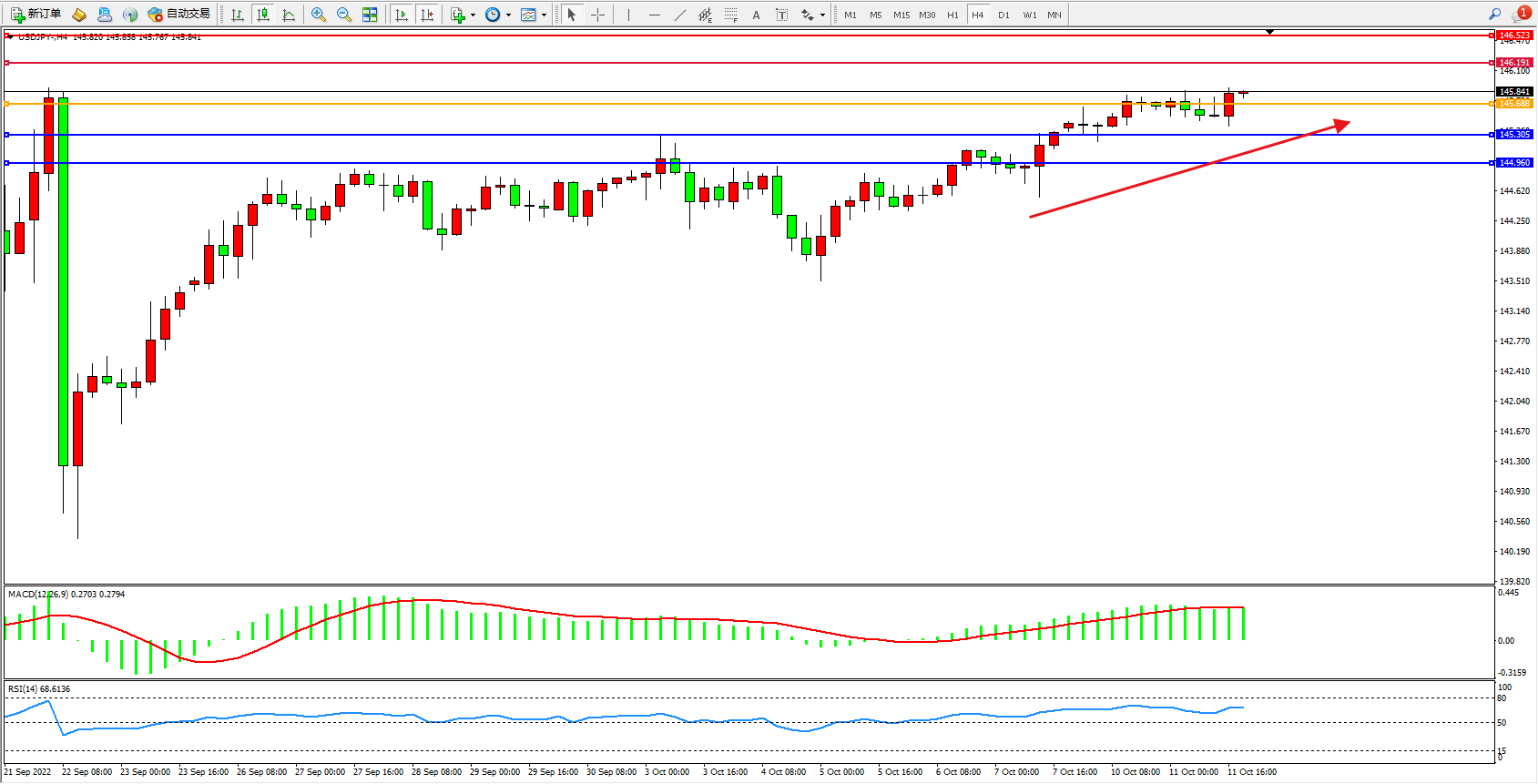 美元日圆USDJPY——4小时K线图显示: