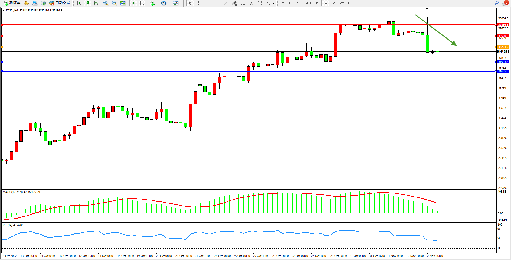 道琼斯指数DJ30——4小时K线图显示:
