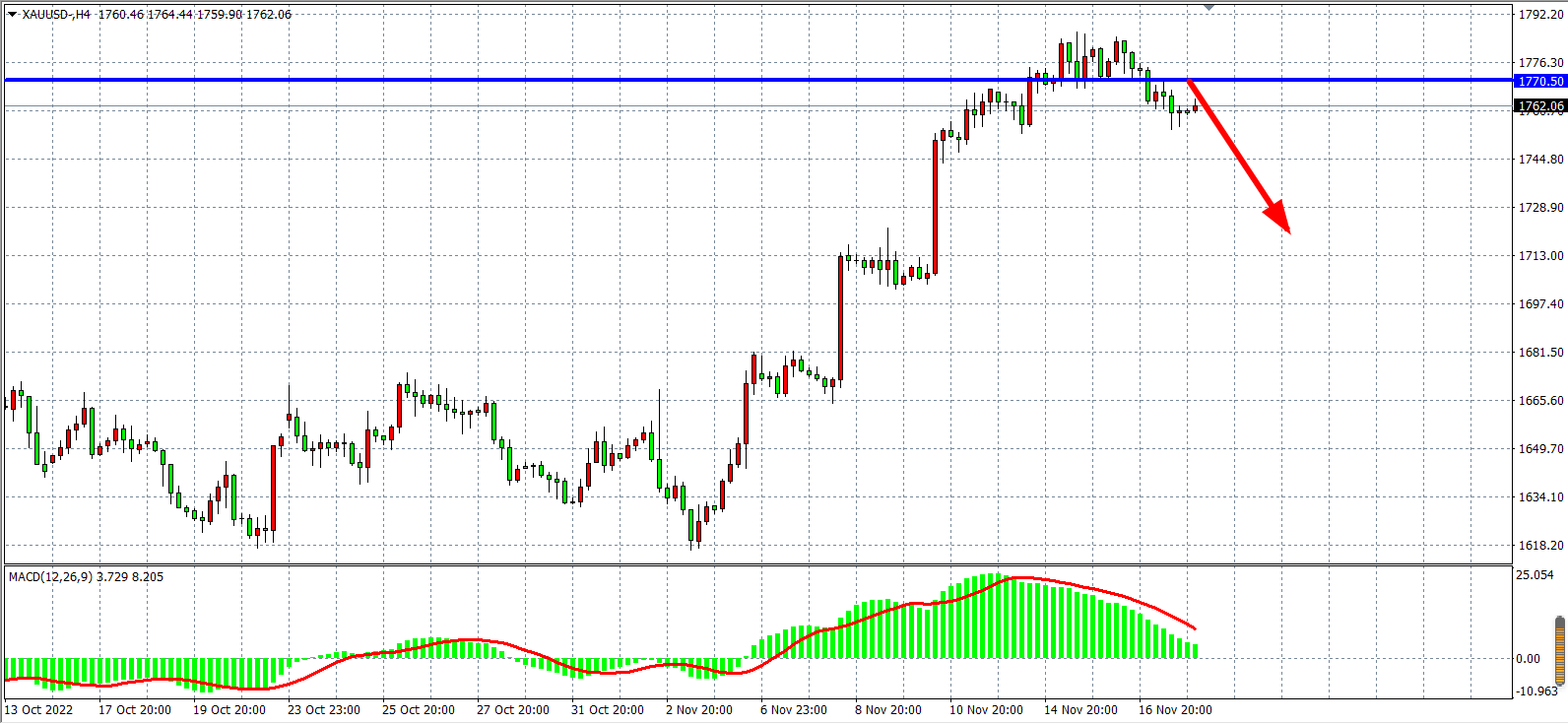 周四(11月17日)美联储多位官员发言暗示还远未结束加息,而且上周美国首请失业金人数不增反降,接近历史低位,凸显就业市场强劲,增强加息理由,美元指数和美债收益率双双走高,现货黄金承压下跌,盘中跌破1760关口,最终收跌0.74%。