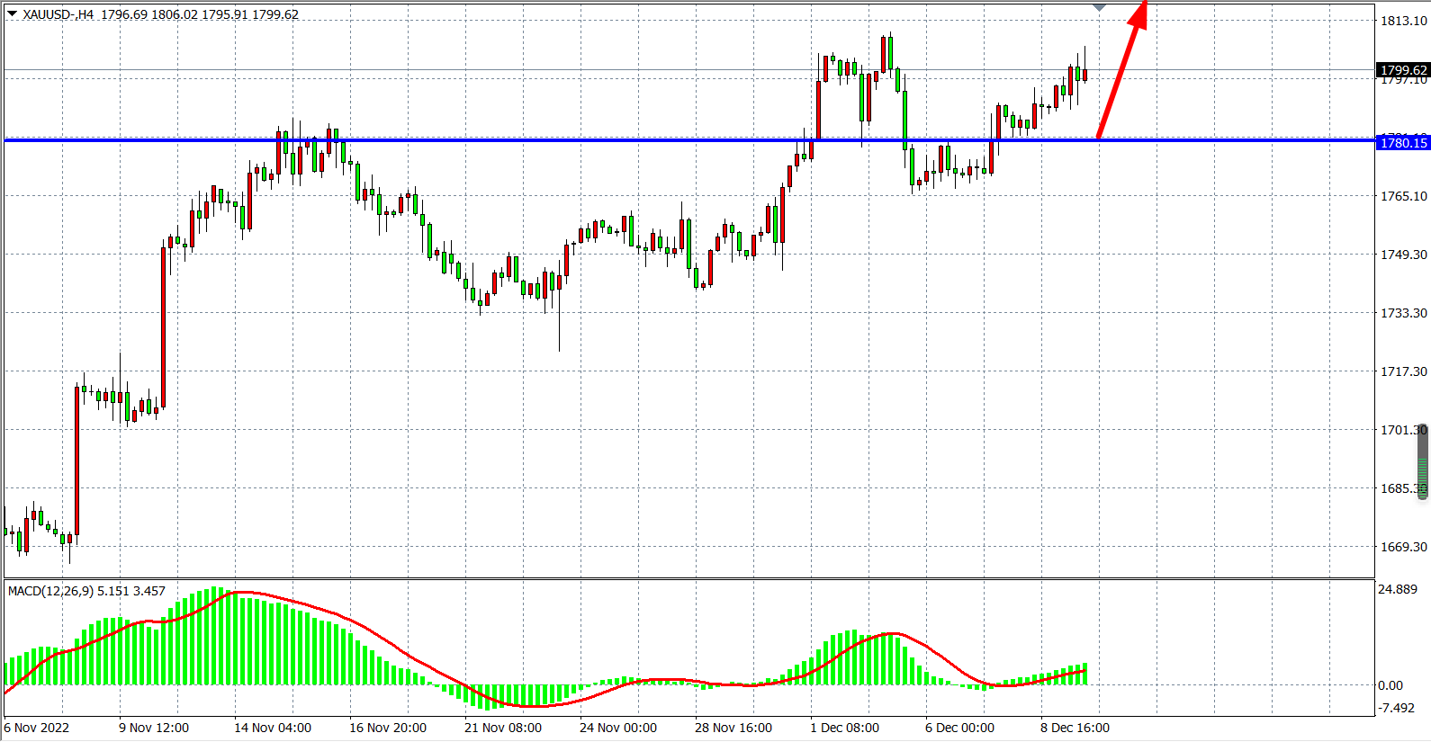 4小时图看,金价在1780之上获得支撑后继续走高,同时MACD在零轴之上持续放量,预示行情有望延续上行趋势,当前支撑继续关注1780美元,在该位之上看涨1810-1825附近